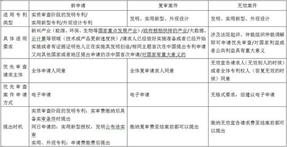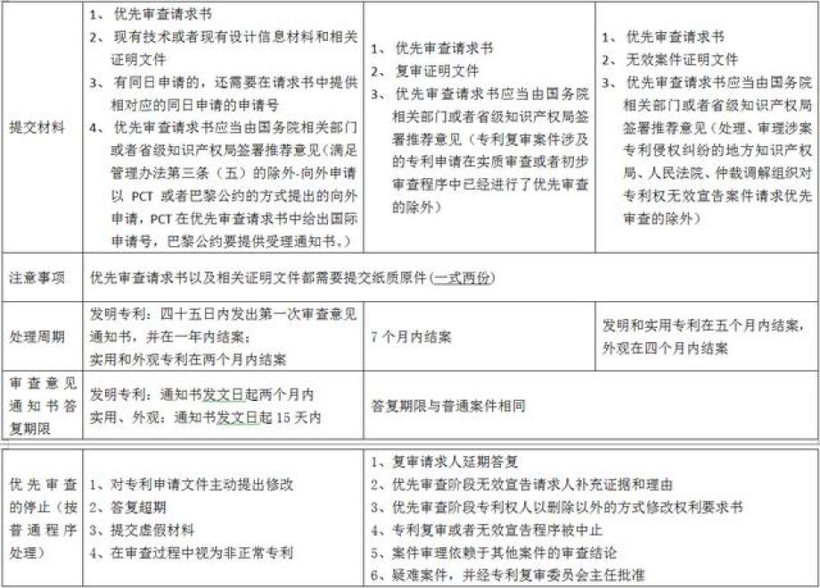 | 专利审查的周期,发明为一年半到两年时间,实用新型专利的审查周期为7-14个月,外观设计专利的审查周期为4-6个月。而遇上赶项目申报进度或者急着招投标的情况下,迟迟等不到审查结果该如何是好?其实专利审查周期是可以缩短的,学会专利优先审查,专利申请快人一步,让你的专利申请插个队。 为了促进产业结构优化升级,推进国家知识产权战略实施和知识产权强国建设,服务创新驱动发展,完善专利审查程序,根据《中华人民共和国专利法》和《中华人民共和国专利法实施细则》的有关规定,国家知识产权局制定了《专利优先审查管理办法》(见国家知识产权局令 76号)。小编整理了表格以对比形式带着大家解读优先审查管理办法。